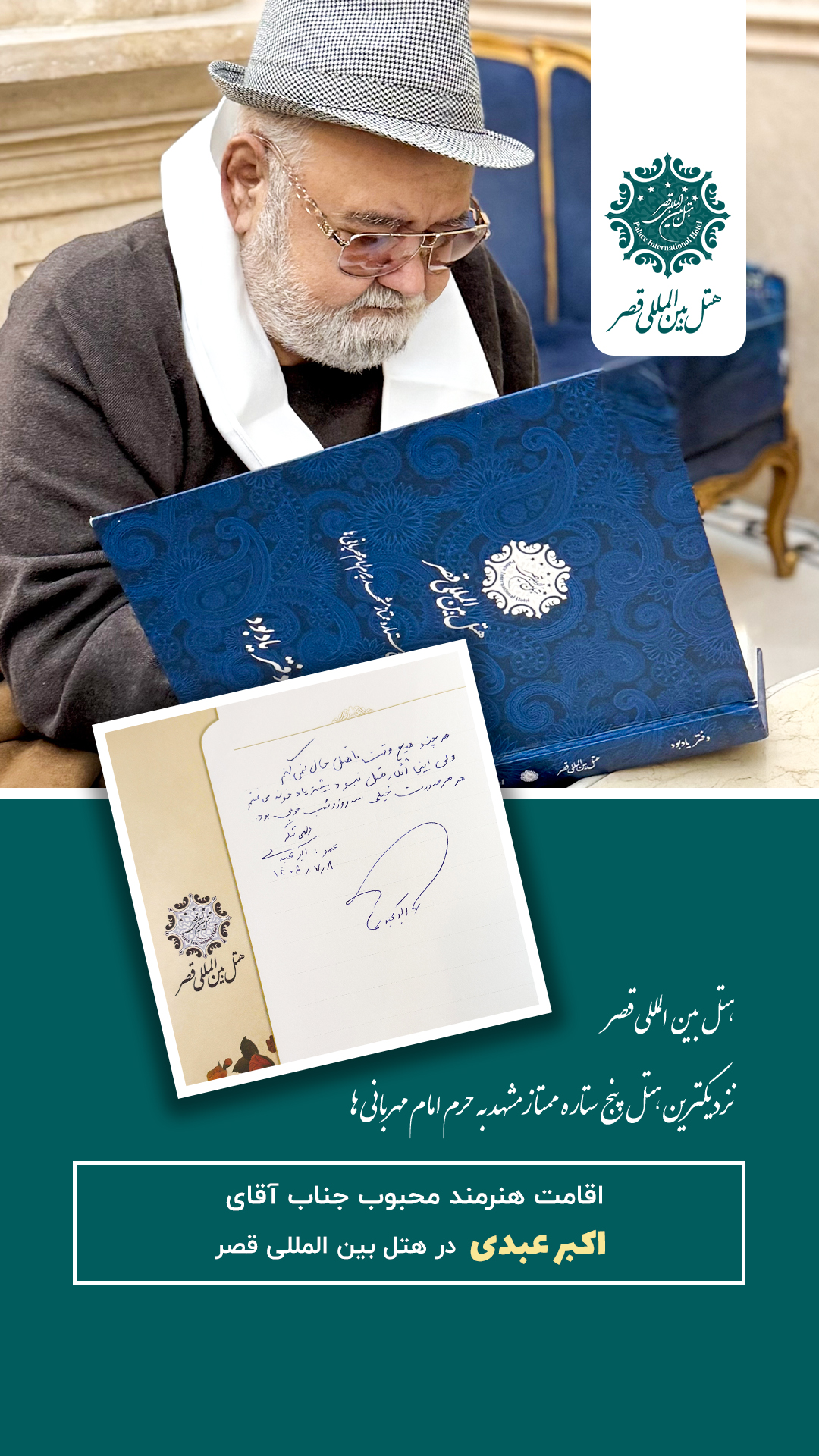 اقامت افتخارآمیز هنرمند محبوب کشور، جناب آقای اکبر عبدی در هتل بینالمللی قصر، برگ زرینی در دفتر افتخارات ماست.